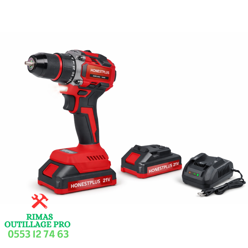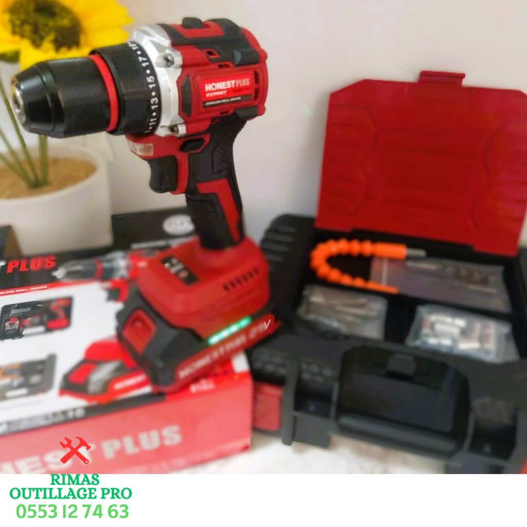 مثقاب لاسلكي HONESTPLUS 21V بدون فحمات (Brushless) قوي و عملي لجميع الأشغال المنزلية و المهنية.